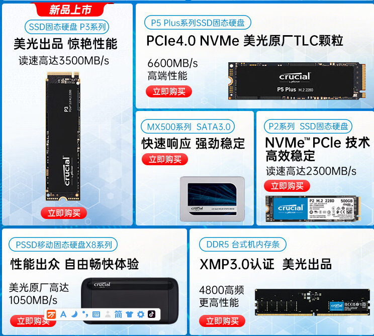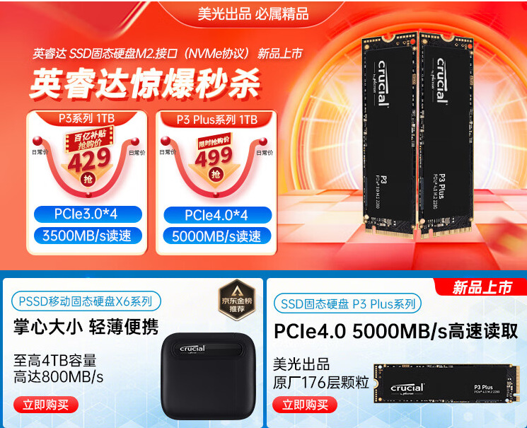 英睿达 P2系列 M2 2280 NVME 250G 500G 1TB 1TB