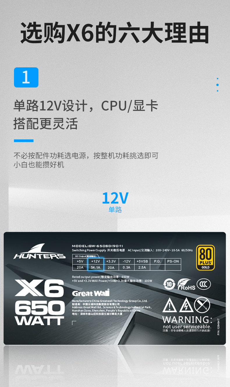 长城X6金牌 额定650W全模电源宽幅单路12V静音台式机电源适用