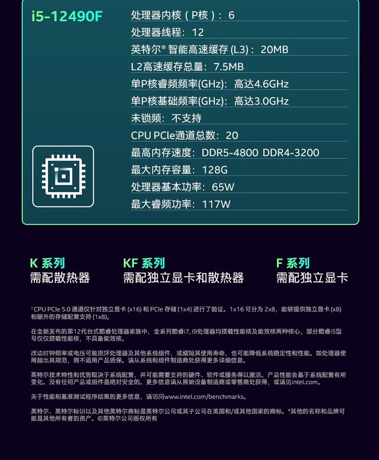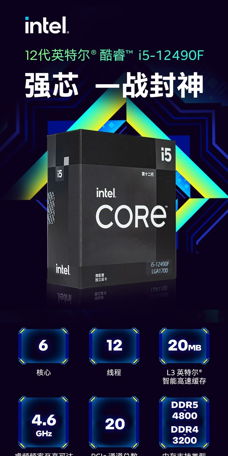 适用Intel/英特尔I5-12490F盒装CPU主频3GHz适用H610/B660/Z690主