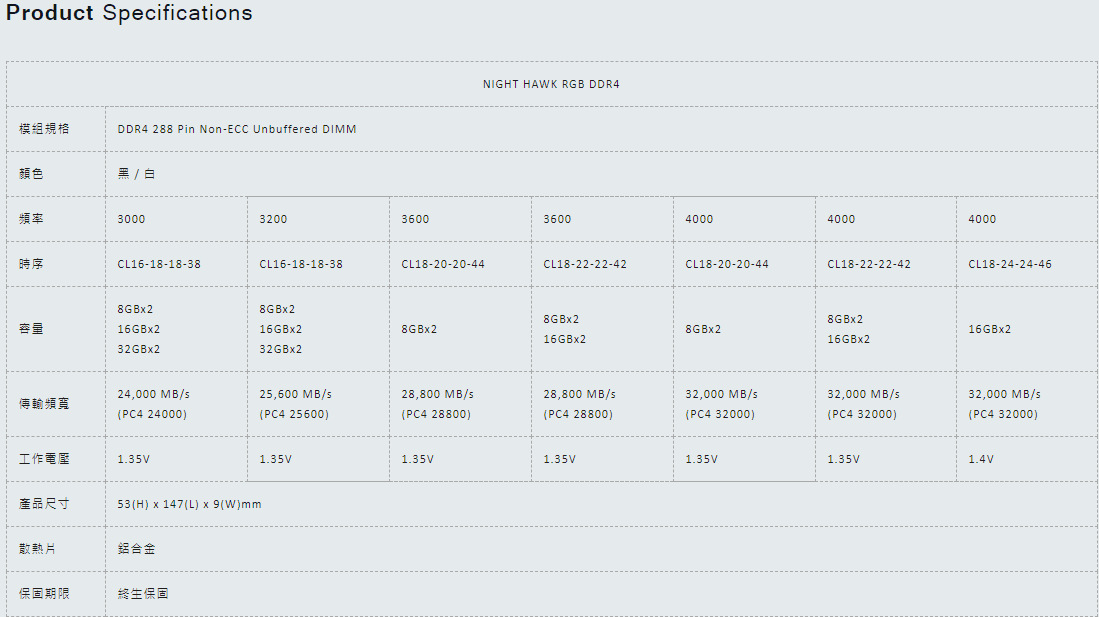 NIGHT HAWK Legend 夜鷹 RGB DDR4 桌上型記憶體4000 3600 3200